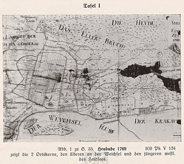 Przedstawia 2 ośrodki miejscowości, najstarszy - nad rzeką Wisłą i późniejszy - na zachód od Pustego Stawu. Stały się one podwalinami dzisiejszej dzielnicy.